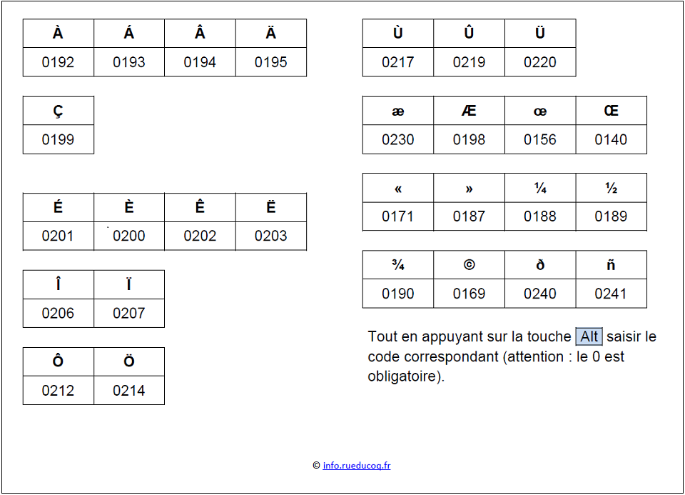 Le plus rapide est de saisir le code ASCII si on l'a mémorisé (ou si on l'a sous la main). Par exemple les tableaux ci-dessous :