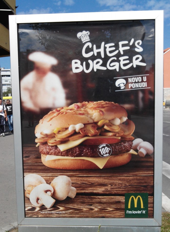La référence ce n'est pas le cow-boy ou le mineur américain mais le chef français. Les Croates étant friands de champignons grillés, MacDo s'adapte. À noter également les lardons + fromage qui remplacent l'inamovible sésame.